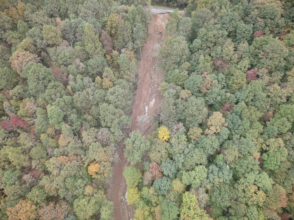 Many landslides have washed out large portions of the roadway. One near Asheville, at Milepost 401, extends hundreds of feet vertically into the valley.